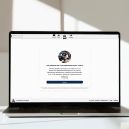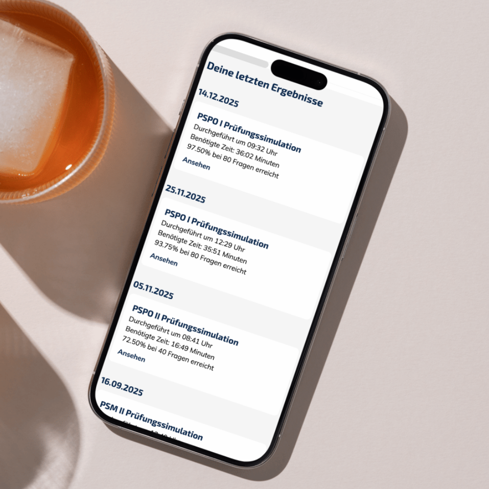 Fragen, Wiederholungen und Inhalte orientieren sich an den Anforderungen der Scrum.org-Zertifizierungen.